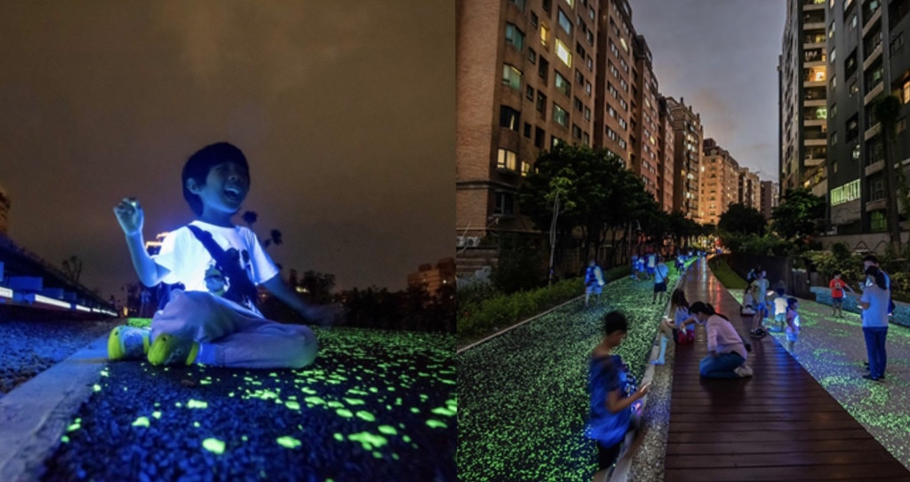 在這些路段裡最吸睛的就屬民光東路與三元街段的「蓄光石星光步道」,將蓄光池舖設在人行與自行車道上,到了晚上釋放出亮麗的螢光色彩,既漂亮又迷人,好像走在奇幻步道上。