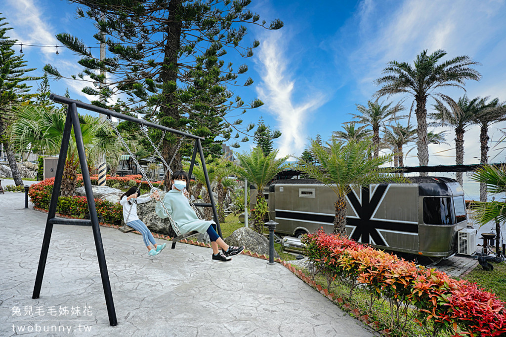 園區擁有絕佳的海景視野,在露營車內或戶外休憩區都可欣賞遼闊的大海景觀。小朋友則有一般鞦韆、鳥巢鞦韆與大型細白沙坑,爸媽放鬆賞景之時,小朋友也能開心玩。