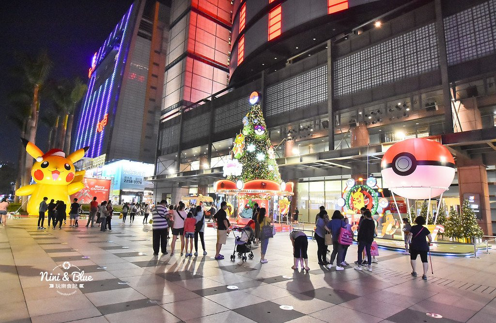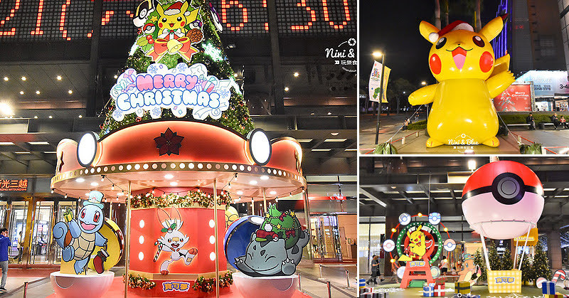 百貨門前廣場出現6公尺高巨大皮卡丘,戴著紅白耶誕帽模樣討喜;大大的聖誕樹下方是寶可夢旋轉木馬,一旁還有精靈球熱氣球、寶可夢摩天輪等造景。