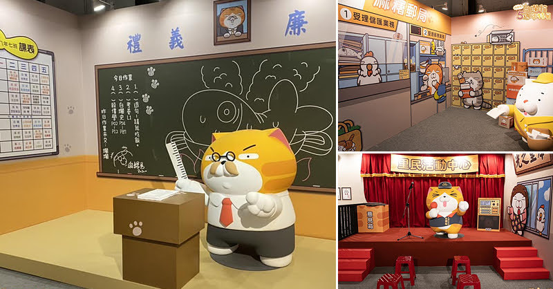 場內以白爛貓世界為主軸,有火車站、里長室、里民活動中心、公園、電影院、早餐店、美術館、學校、銀行、警局等超多佈景,每個佈景都做的很精緻,還有各種姿勢表情的白爛貓立體公仔,搞笑又逗趣的模樣,真是可愛。