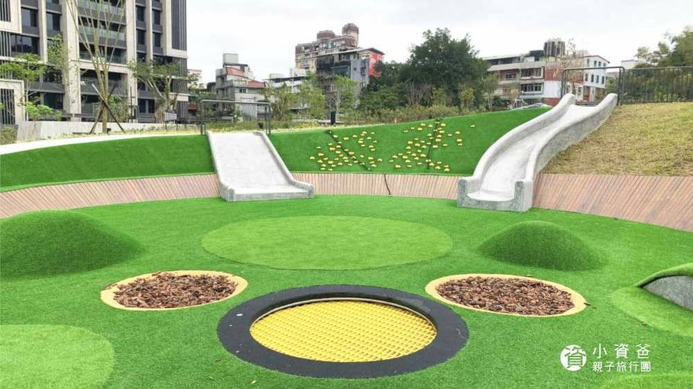 共融遊戲場設施多元,有大小共2座磨石子溜滑梯、小山丘、彈跳床、攀岩牆、單人旋轉杯、多人搖搖盤、獨木橋、大型戲沙坑、沙桌、敲打音樂,還有3座不同大小的原木攀爬架。