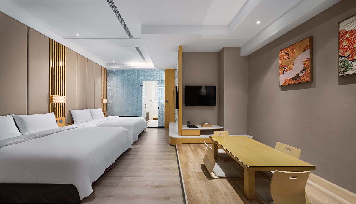 飯店內有雙人及四人房型,房內以木質裝加上明亮採光,打造舒適的空間,房內擺放和式桌椅,帶點日式風情,房內泡湯池不小,小朋友開心玩水,爸媽則可放鬆享受,消除工作累積的壓力。