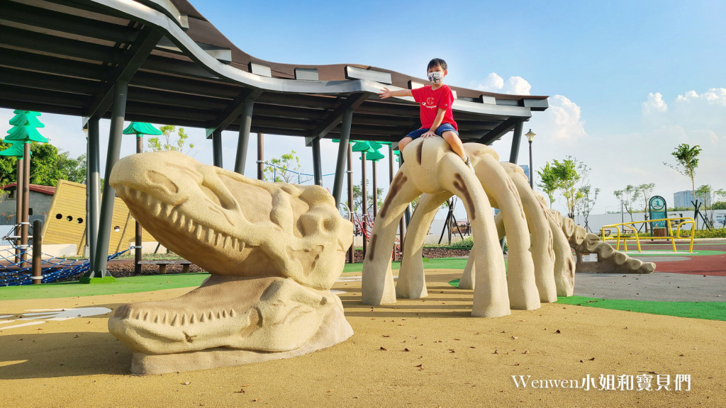 兒童遊戲場屬一期開放區,爸媽先帶小朋友來放電趣。遊戲場以「尋找侏儸紀」為主題,處處可見恐龍元素,地上還有大型恐龍化石攀爬架,滿足小朋友征服恐龍的熱血。多元的遊樂設施有磨石子溜滑梯、泰山溜索、彈跳床、波浪攀爬架、海盜船戲沙坑、挖土機、多人旋轉盤、叢林體能攀爬區,小朋友愛的鞦韆有輪胎、尿布及鳥巢3種。