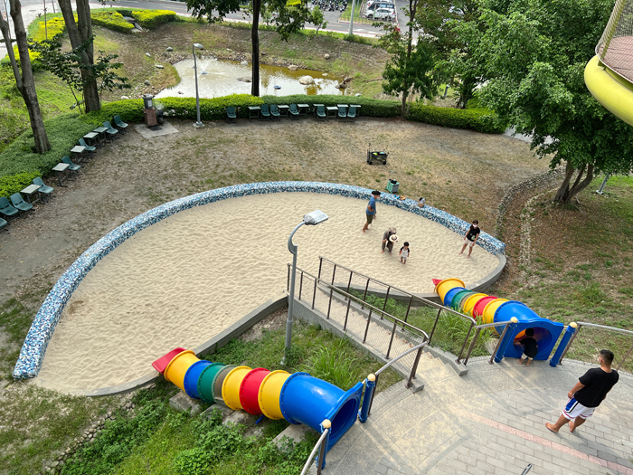 這裡很適合全家來踏青遊樂,小朋友有溜滑梯、沙坑、攀岩牆、戲水池、大草坪、泡泡足球可以玩,大人則可在樹林野餐區休憩享用輕食小點,坐在樹蔭下吹著涼風好不愜意,且樹林野餐區旁還有不少攀爬擺盪遊具,讓小朋友盡情放電。