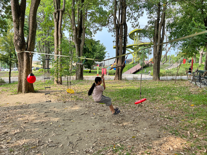 可以挑戰平衡、攀爬、擺盪,且樹林下不會直接曬到太陽,很受大小朋友喜愛。