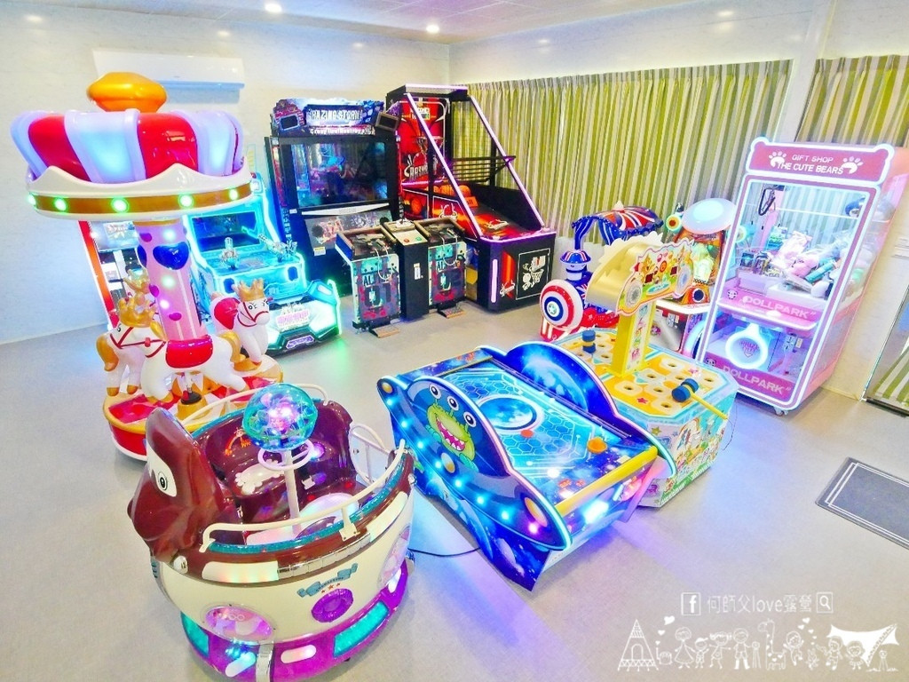 包棟住宿可獨享交誼廳空間,裡面有沙發座椅、電視、幼兒滑步車等,並供應小零食與咖啡茶等飲品。投幣式遊戲機就在交誼廳旁,有投籃機、旋轉木馬、打地鼠、射擊遊戲、冰球、賽車等11種機台,一次1-2枚代幣即可玩。