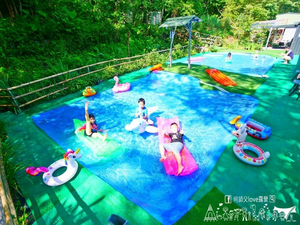 營地雨棚空間夠大,且設有遮陽遮風布,遇到雨天也能乾爽收帳;草地營位也都保有足夠的活動空間,不擁擠。小朋友露這裡有戲水池以及充氣泳具,夏天泡在清涼的山泉水裡都不想離開了;另一側有溜滑梯遊具組、零食夾娃娃機、DIY棉花糖機,若當日滿帳的話,還會舉辦免費的搗麻糬活動哦。