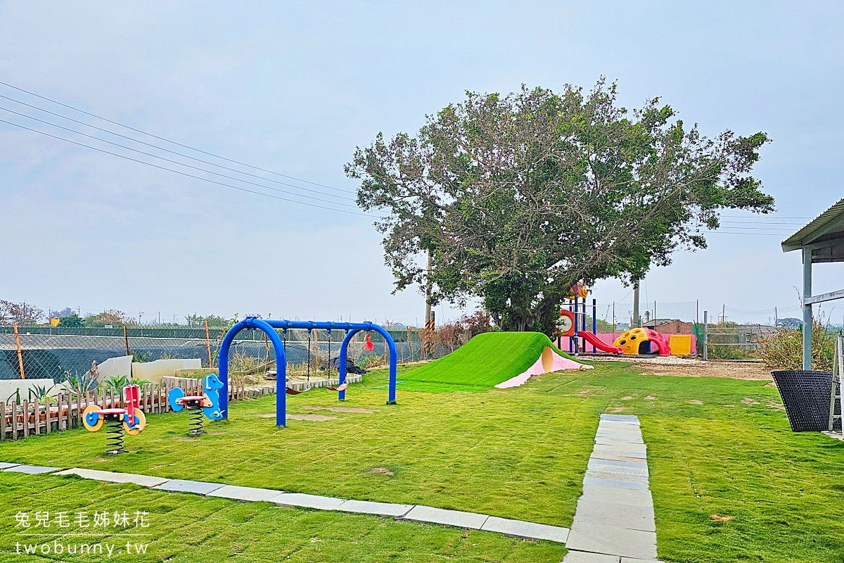 兒童遊戲區就在用餐區旁,戶外空間舖上柔軟草皮,有溜滑梯、半圓攀爬架、盪鞦韆、搖搖馬、小型滑草坡等,爸媽在認真烤蚵時,小朋友能有的玩就不怕無聊。