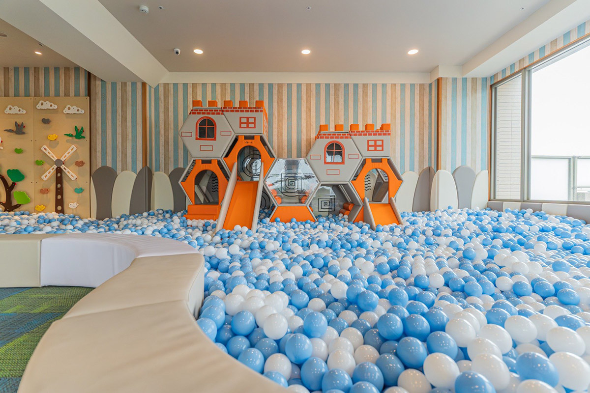 位在5樓的公共空間有健房器材、兒童球池遊戲區、繪本圖書、休閒桌椅等設施讓房客使用,入住依方案有提供吃到飽下午茶點,有沙拉、麵包、甜點、炸物、冰淇淋、飲品等,晚上周邊有超商、麥當勞、肯德基、壽司郎,小吃店家也不少,覓食便利。