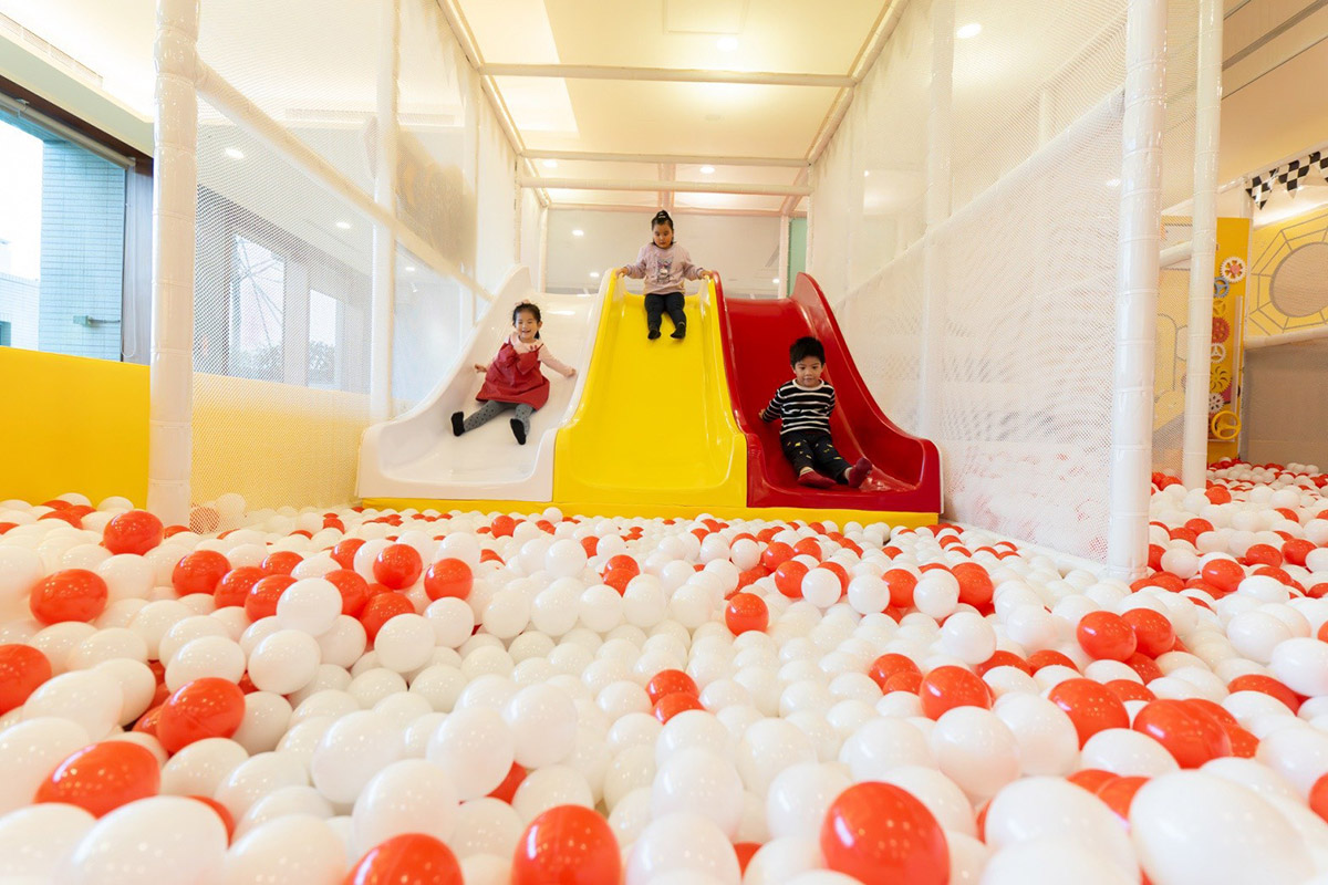 另一層的貝貝遊戲區則適合更小一點的小朋友來玩,提供小小滑梯跟球池樂園、攀爬牆等。