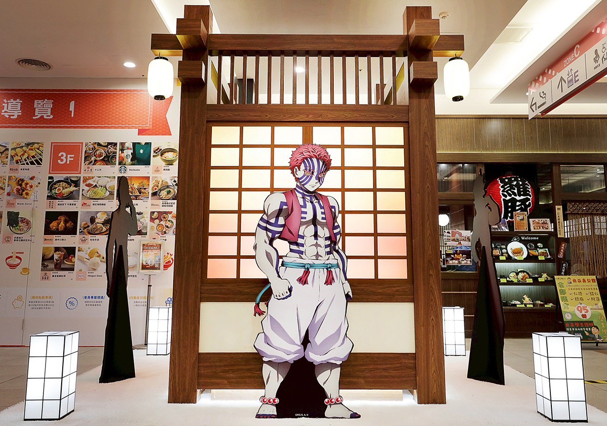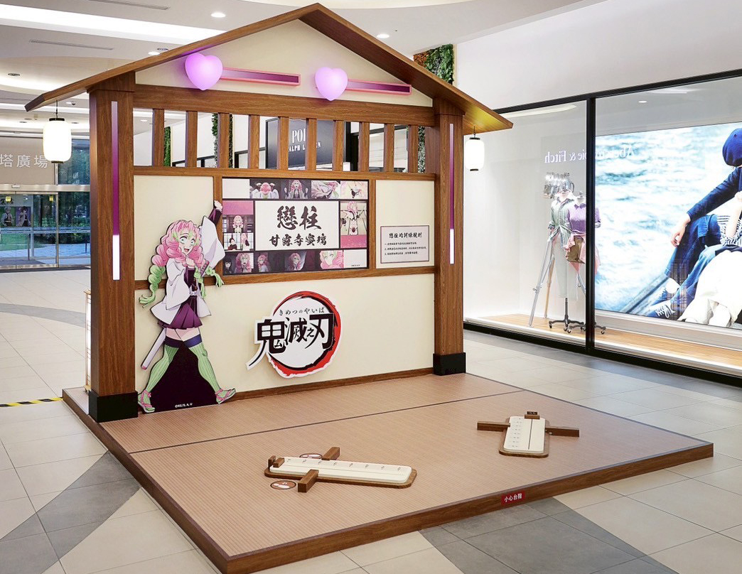 5座主題造景分別設置在1樓樹塔廣場口與2樓E區,和式小屋造景與木窗格充滿日式氛圍,可以看到炭治郎、彌豆子、戀柱、霞柱等主要角色,還有讓人害怕的上弦之鬼與鬼舞辻無慘;除了拍照外,在戀柱訓練場還有一座可愛的坐姿體前彎裝置,歡迎大小朋友一起來挑戰身體的柔軟度。
