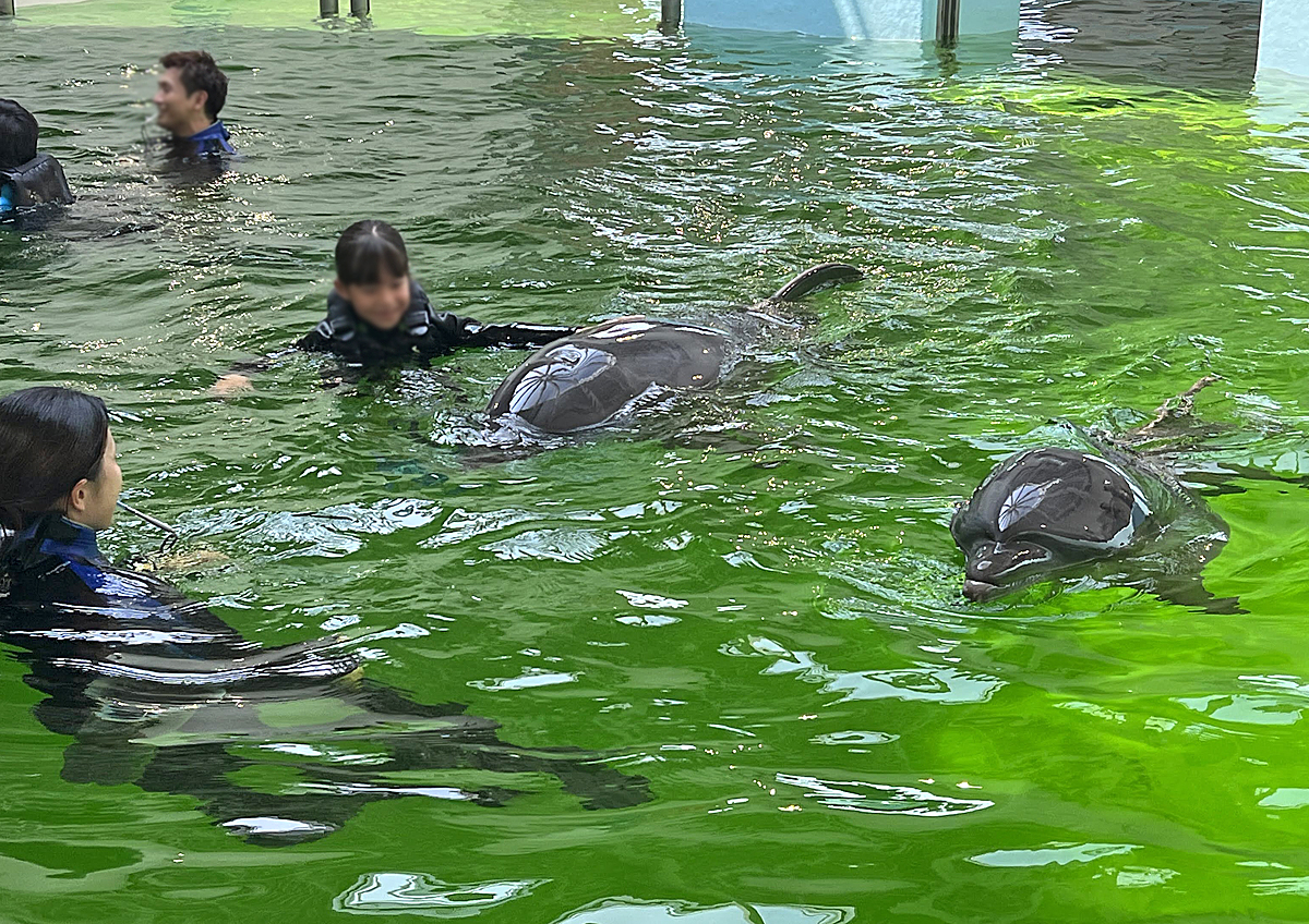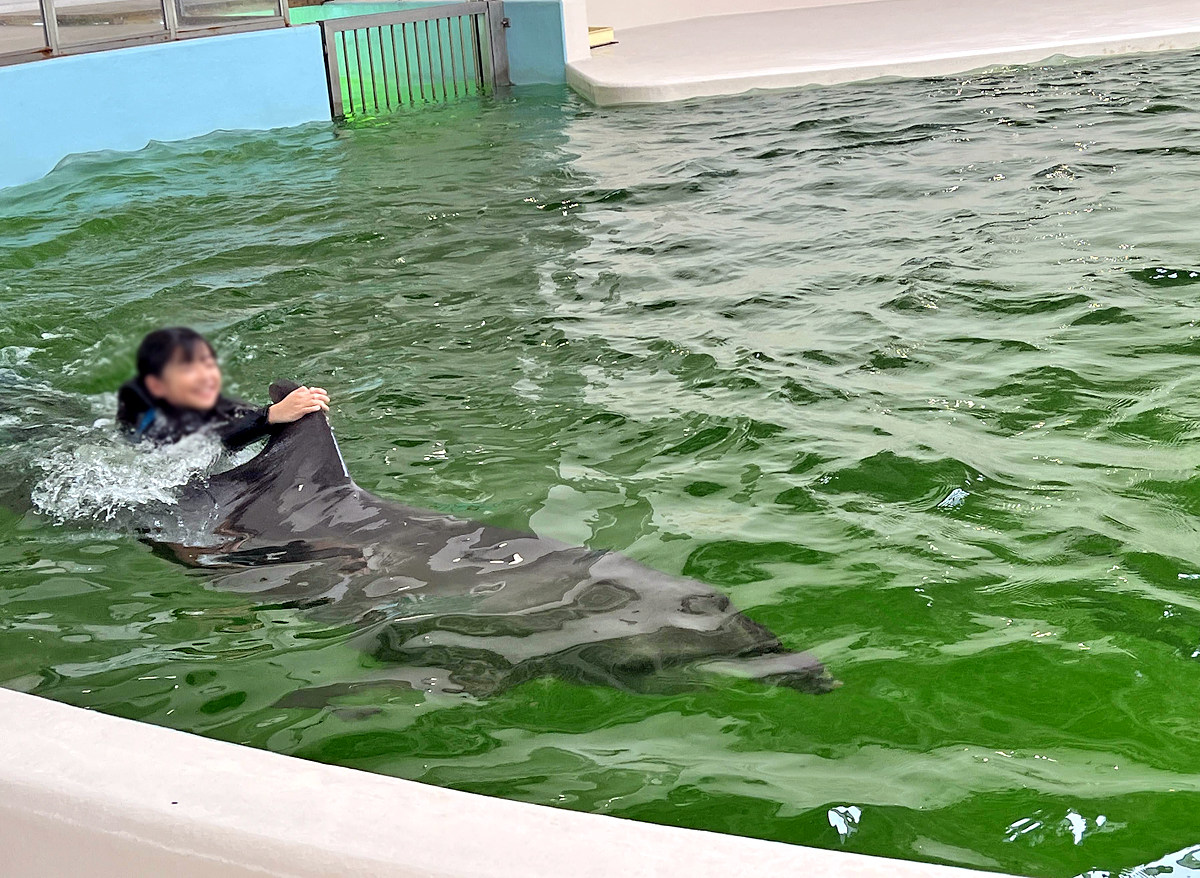 海豚共游非常特別!大小朋友換上潛水裝,在池子裡與牠們共游,還可以體驗被海豚載著游泳。