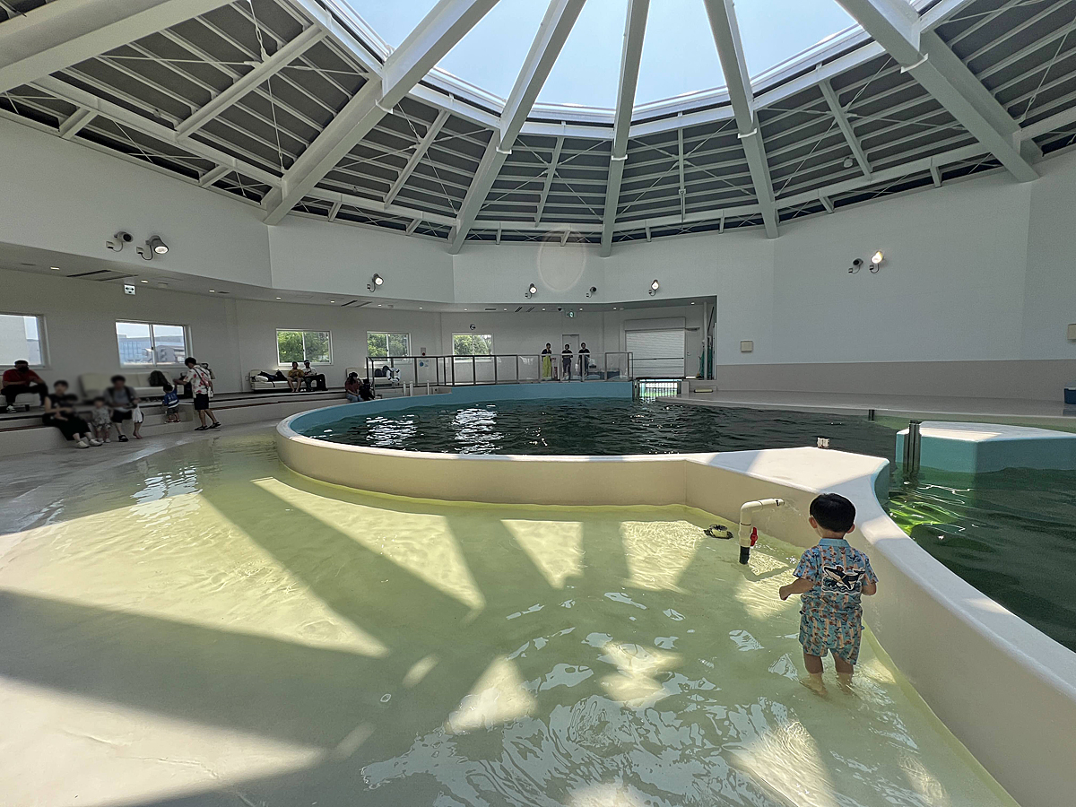 這裡不是一般的水族館,館內空間也不算大,裡面只有養海豚,2層樓的空間,主要場域在2樓;挑高的空間有一座大池子,海豚們在裡面自在悠游,大小朋友可以直接站在池子旁超近距離觀看海豚,每天定時也有海豚表演哦。