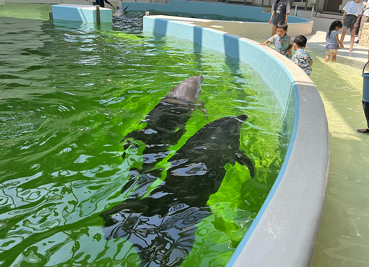 館內每天都有定時海豚餵食秀與表演,不用站遠遠觀看,在池邊就可以看到牠們可愛活潑的模樣。