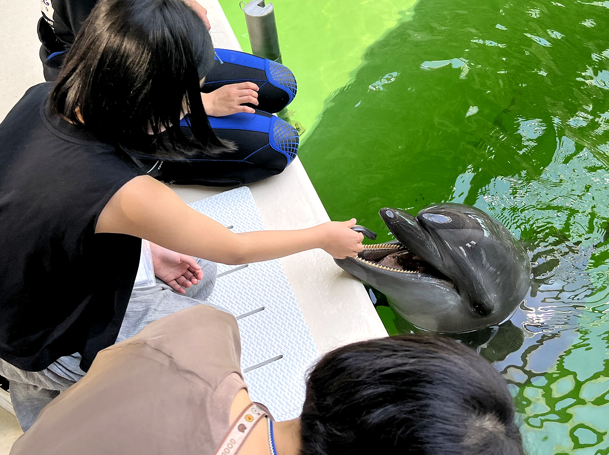 來這裡建議報名體驗活動,最便宜的是餵食體驗,拿起小魚餵海豚,還可以摸摸牠們,滑溜的觸感真神奇。