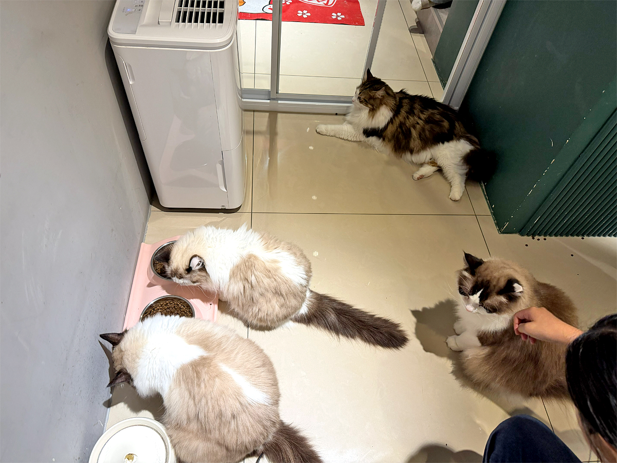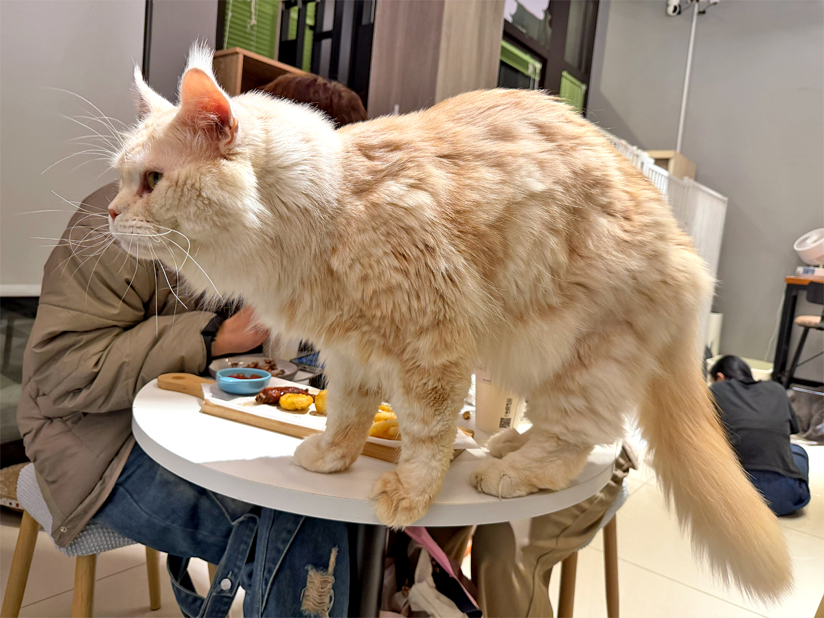 註:貓咪不能吃人類的食物,若牠們跳上桌,可以請工作人員幫忙抱下去。