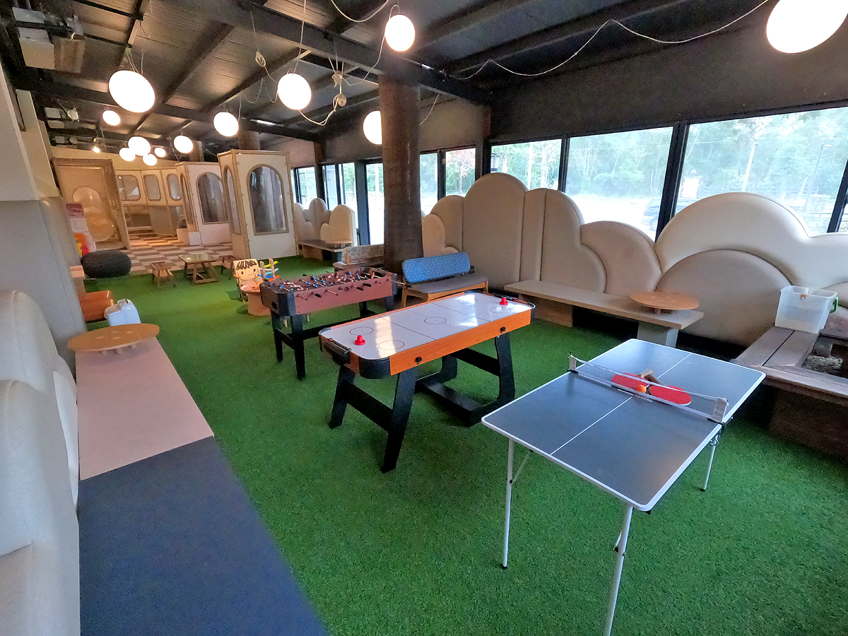 拓村泉旅主建物包含接待大廳、餐廳與兒童遊戲室,遊戲空間設計的很有質感,有溜滑梯、闖關遊戲、大積木、搖搖椅、小型桌球/手足球/冰球桌等,且入住方案大部份都包含兆豐休閒農場門票,再帶小朋友去看動物、互動餵食,玩上2天1夜剛剛好。