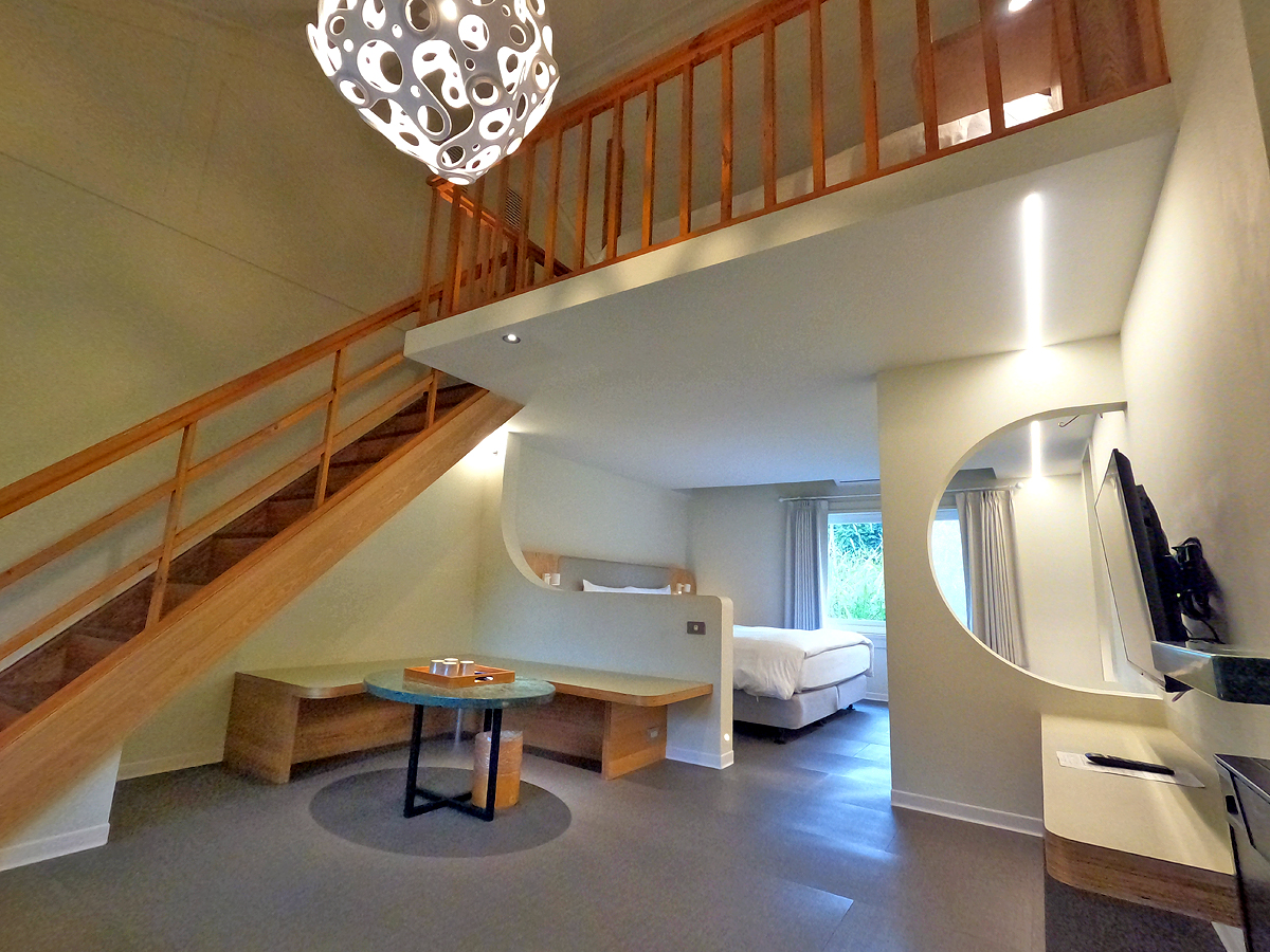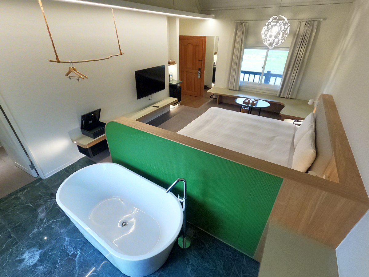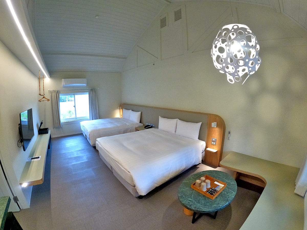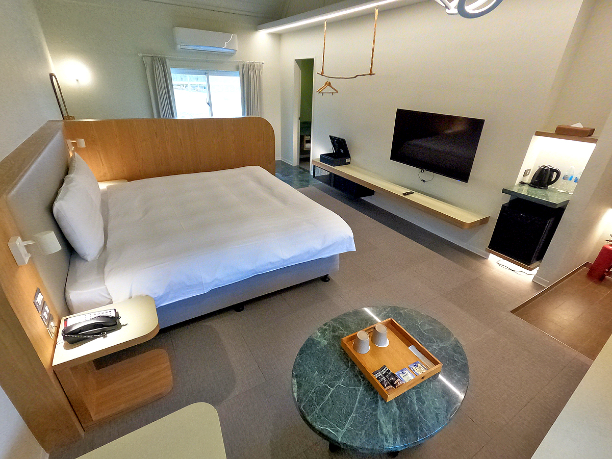 屋內使用大自然色系,清爽明亮;雙人房配置一大床,一旁有個小客廳空間。
