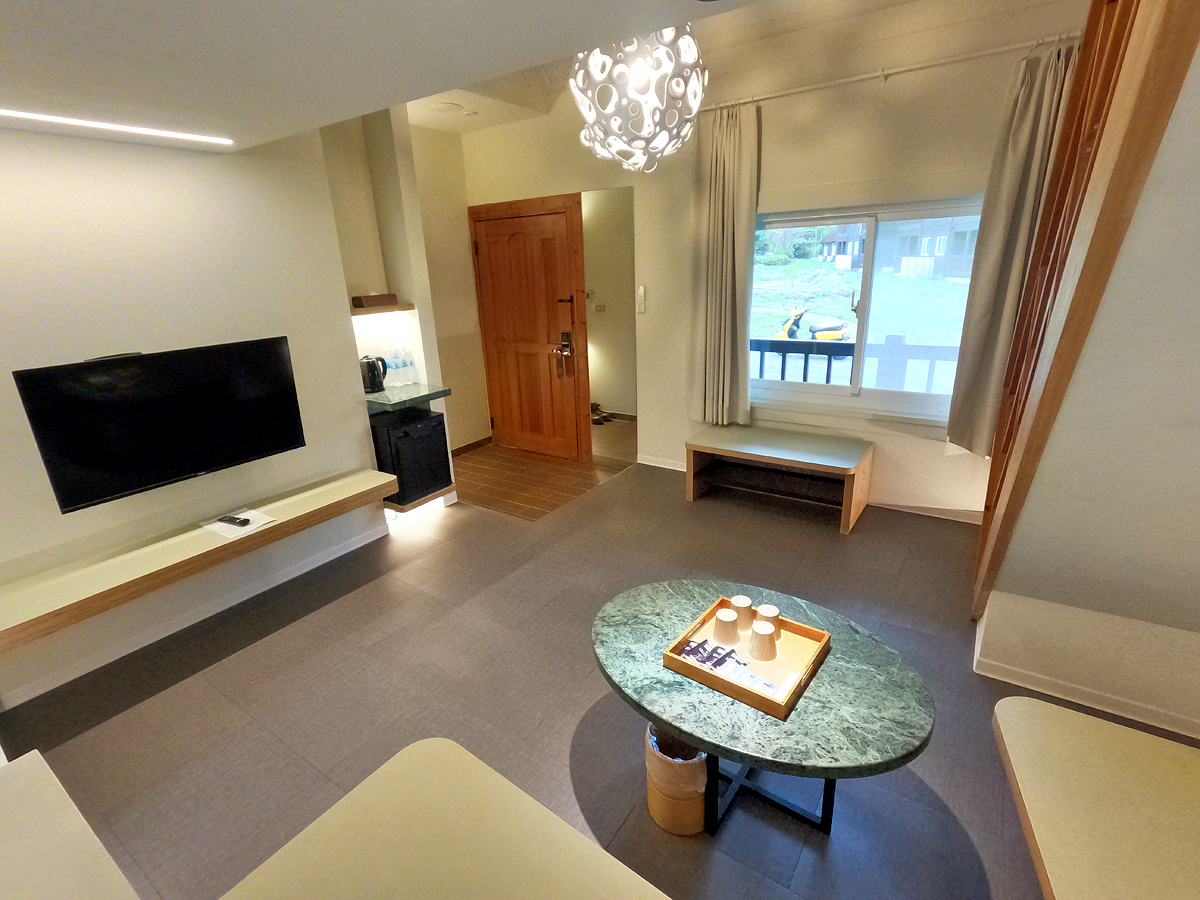 入住的小木屋有雙人、家庭與家庭閣樓等房型,屋內使用大自然色系,清爽明亮,且挑高的空間、北歐風裝飾營造舒適的住房品質;帶小朋友來可以選擇家庭閣樓房,2層樓的空間,小朋友好像多了秘密基地,開心的跑上跑下。