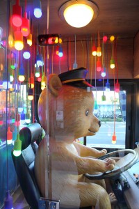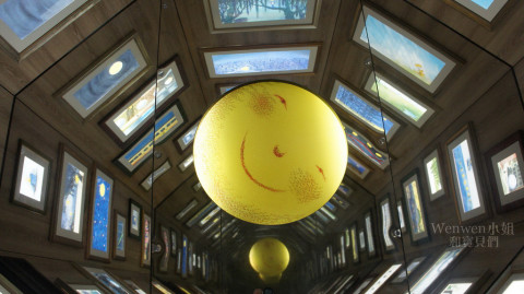 這次的作品是以一台公車為設計元素,除了可以在外面拍照外,也可以真的搭上公車,進入裡面拍照,有可愛的大熊熊做司機,還有繪本主角的小男孩坐在公車上抱著月亮,還有不少幾米的繪畫在裡面展出。