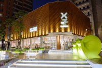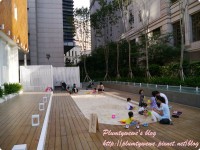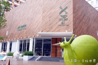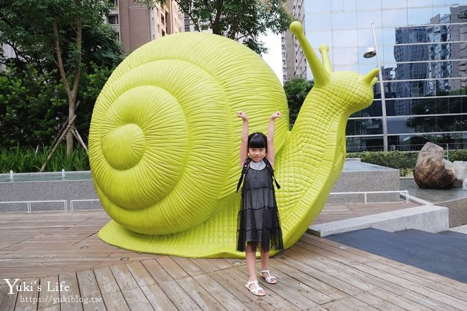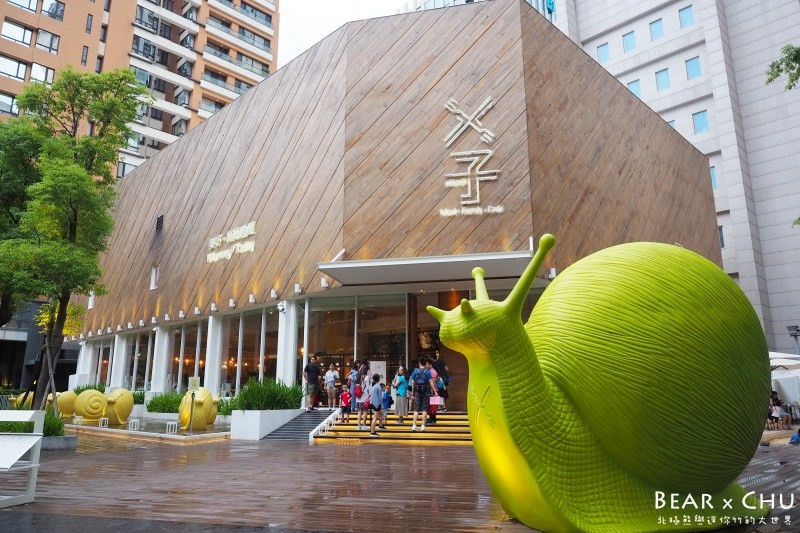 餐廳外觀以大片原木裝飾,戶外有兩隻很大的綠蝸牛藝術品非常的吸睛,綠蝸牛旁就是戶外的兒童沙坑區,沙坑內的沙是白色的貝殼砂,清理比較容易,沙坑旁是原木地板,家長也可以坐在旁邊陪小朋友。
