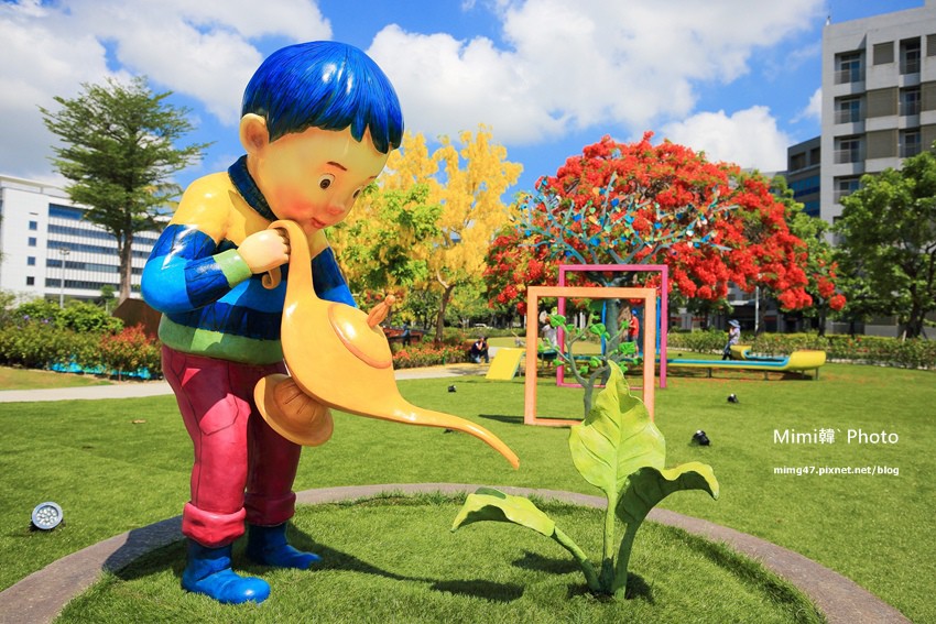 這座充滿童趣的小公園四處可見色彩繽紛的故事人物,連兩側的公車站牌也融入裝置藝術,都有隻立體的貓掛在牌子上面。一進入公園旁,先會看見故事中的小男孩拿著神燈澆水,種下帶著願望的小樹苗,然後依序長出美麗的愛心樹葉,成為大樹。帶小朋友來此遊玩,可以依著公園內的藝術裝置說故事,並鼓勵他們未來要有勇氣懷抱夢想。