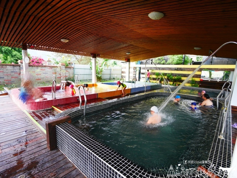 這裡的lobby與餐廳是一棟造型特殊藍白相間的建物,在藍天下特別醒目。大眾泡湯區分為6池,有SPA水柱,半戶外空間不悶熱也不受雨天影響。園區裡有漂亮的戶外造景,大片草地,庭園裡還有不少可愛玩偶,適合帶小朋友來泡溫泉遊玩。