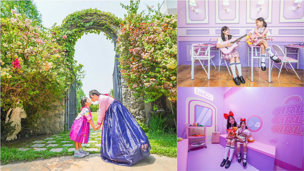莊園於2022年初推出韓服體驗,分為傳統與高校服裝,大人小孩尺寸皆有,提供多樣飾品、鞋子,會幫忙著裝、整理編髮,只要人去就可以美美的拍照,且裡面還設計主題場景,每個都超好拍照的!除了室內拍照外,另有戶外韓服體驗,換上韓服,直接在莊園內取景,歐式花園加上裝置藝術,可以拍出不少漂亮照片。