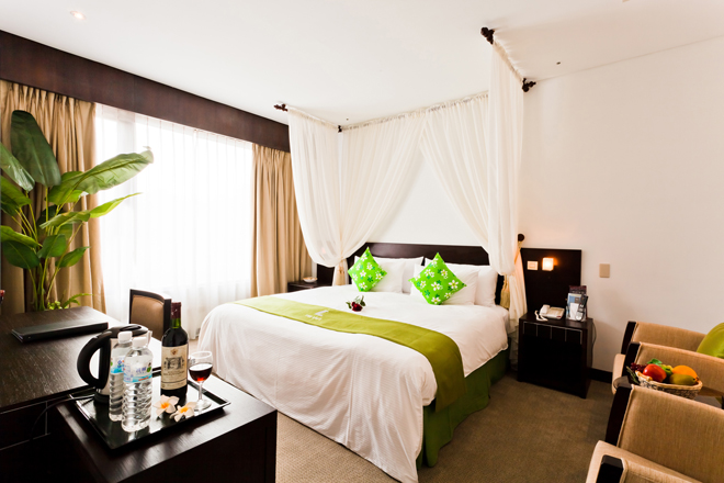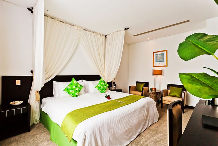 這裡的房間以雙人房為大宗,烏布溫泉套房雙人房適合2大1小(12歲以下)來住宿,房間內部配上床廉跟綠色的抱枕,讓整個房間都活潑了起來。