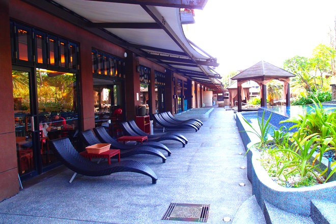 而在泳池旁邊,則有舒適的躺椅,上面也有遮陽,或坐或躺的在這裡悠閒的看著小朋友玩水也很不錯。