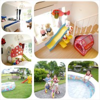 戶外則有草坪,上面放置有許多給小朋友玩的小車車,還有兒童戲水池跟小小溜滑梯等設施,適合親子同遊。