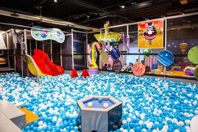 一入場就是偌大的藍白球池區,讓小小孩身陷球海為之瘋狂。球池區牆面有特殊的計分投球板,可以鍛鍊小朋友的手部肌肉,吸球以及倒球機關可以讓小朋友享受球球如瀑布般傾倒而下的快感。此外還有動感砲彈射擊區、互動投影遊戲區、外星人旋轉氣墊、還有非常有趣的體能騎馬道。