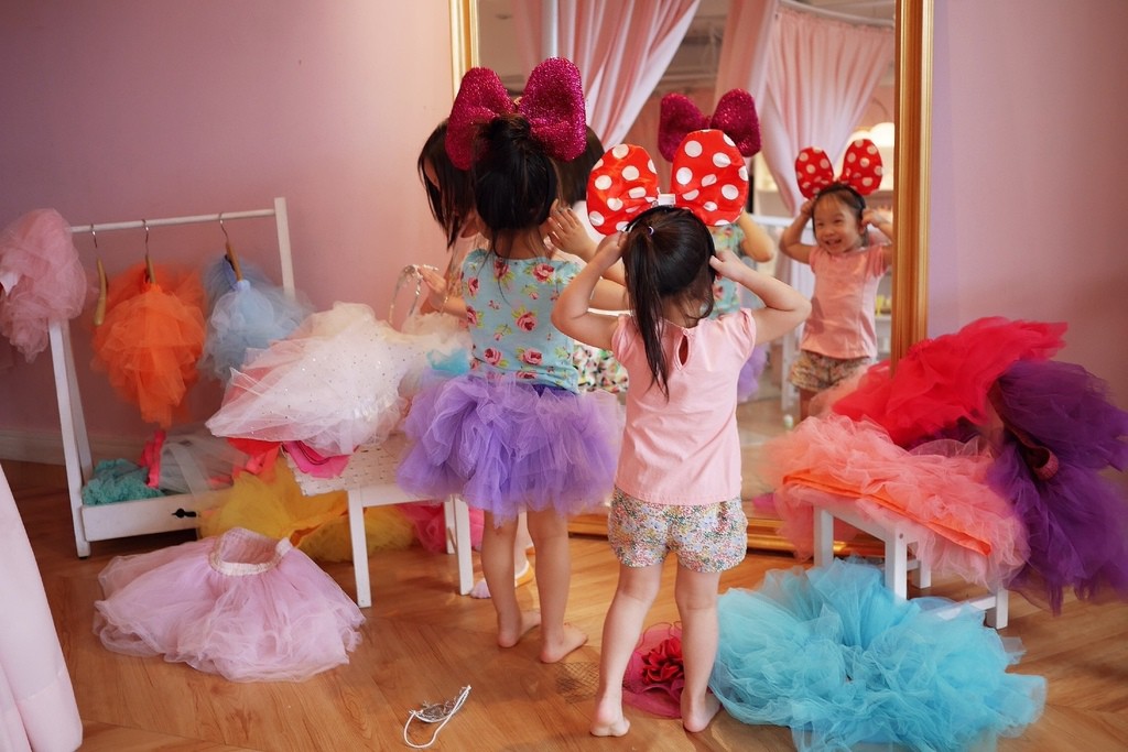 裡面是以公主房間為主題的遊戲區,小女生來這裡可以盡情挑選喜歡各種顏色造型的蓬裙、頭飾或公主皇冠讓小朋友自己打扮,且還有扮家家酒的遊樂設施,可以讓小女生在這裡當個小公主,辦一場屬於自己的迷你版的下午茶派對。