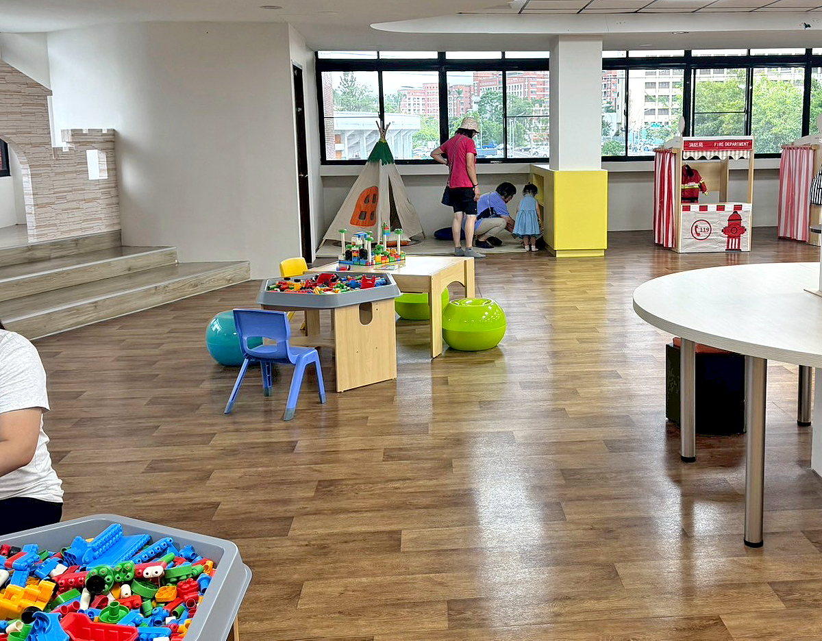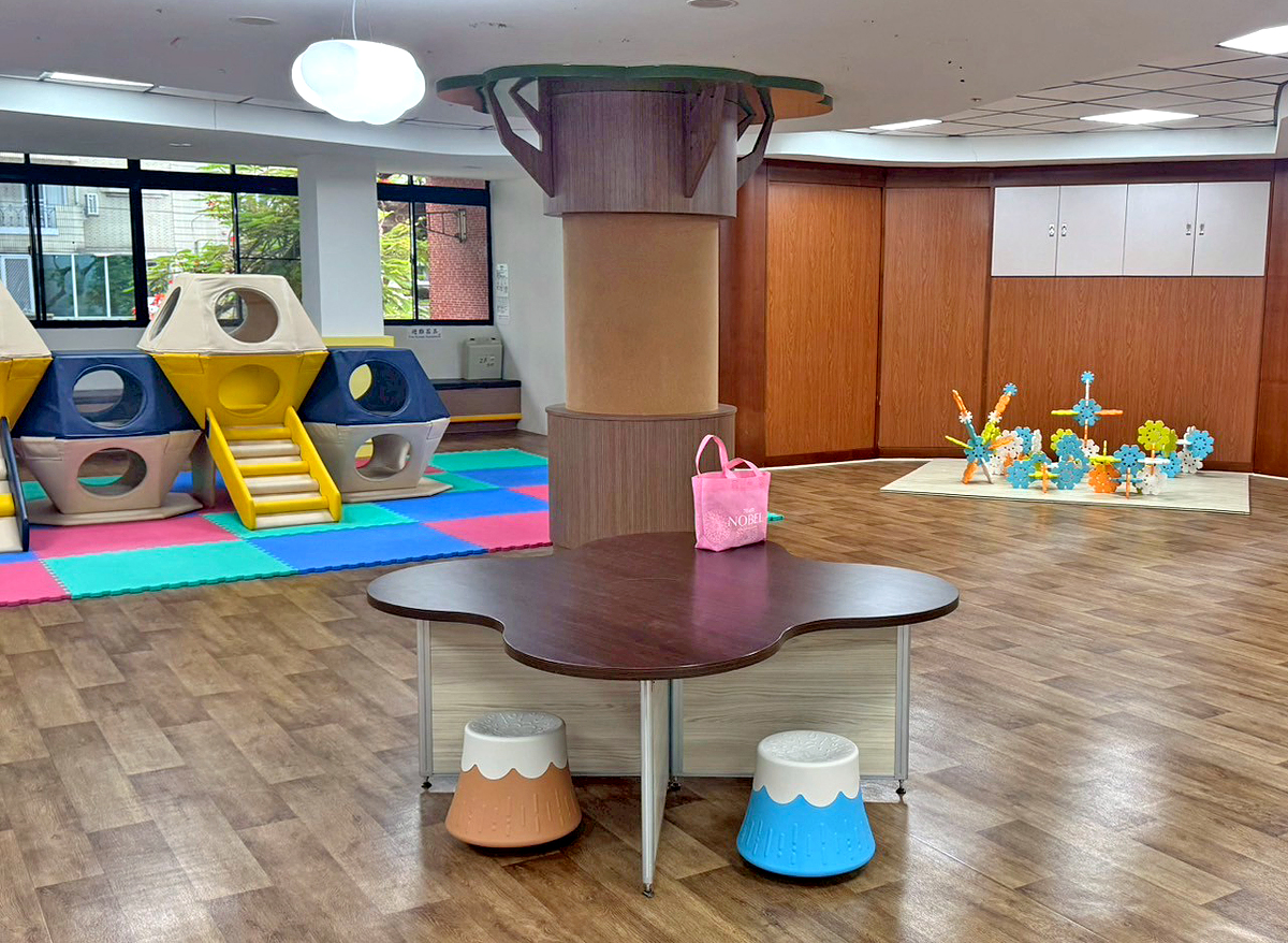 親子遊戲室空間寬敞,有小型攀爬滑梯、大型雪花片。