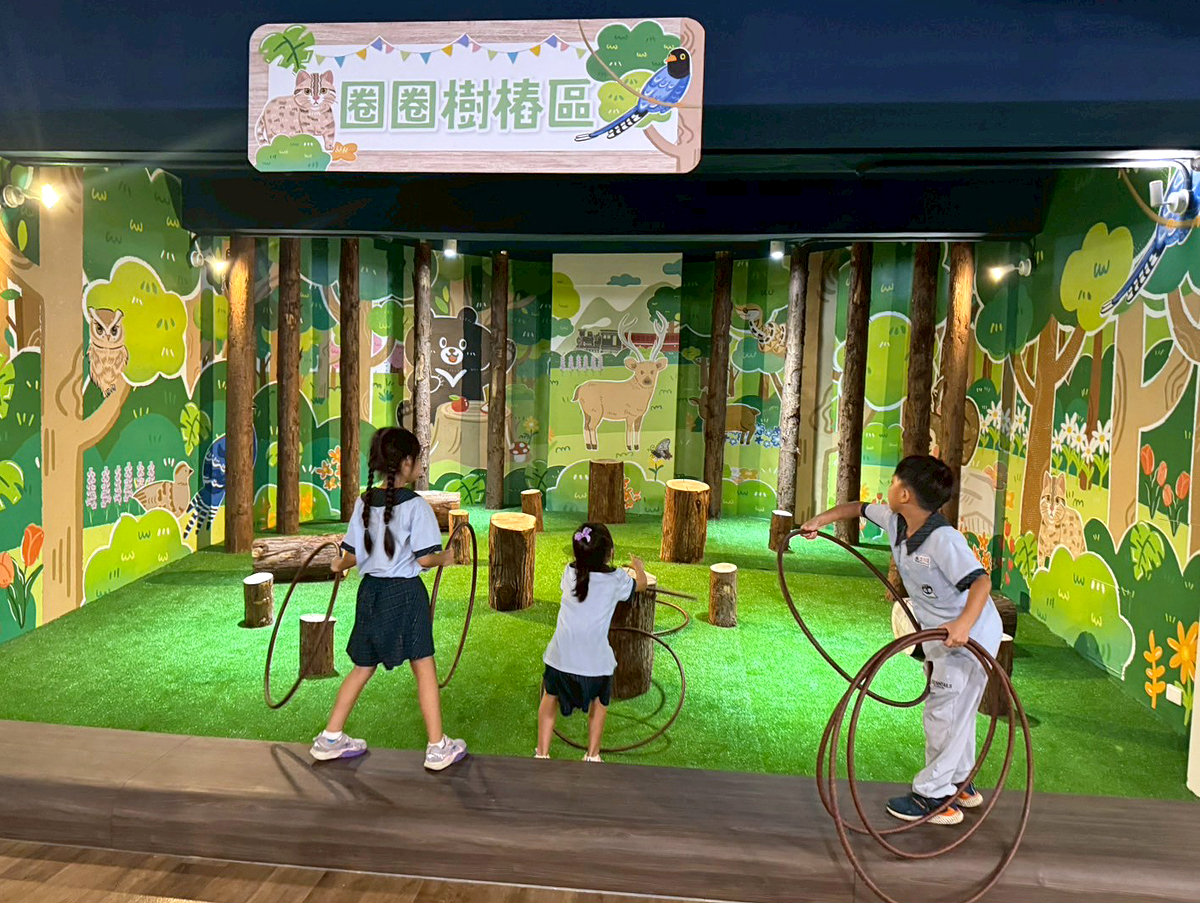 3樓首先看到像座迷你森林的圈圈樹樁區,小朋友拿起大圈圈往前丟,看誰厲害套中的比較多。
