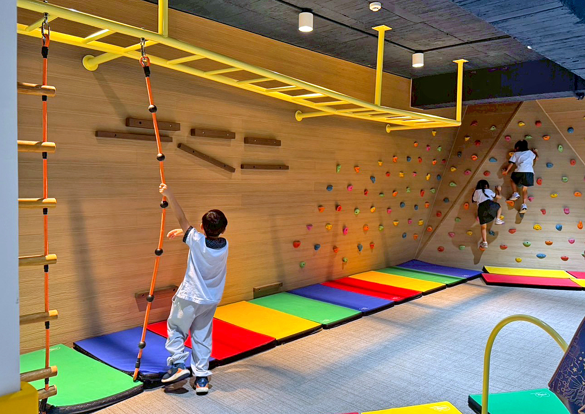 這裡有垂直爬梯、爬索、MONKEY BAR以及攀岩牆,適合中大童來玩。