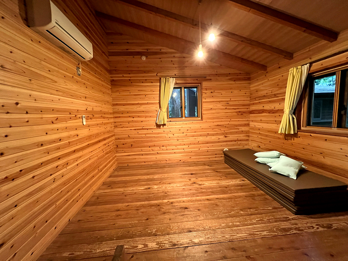 小木屋內空間很寬敞,有冷暖氣機,提供床墊,枕頭、被子等物品需另外付費租借。