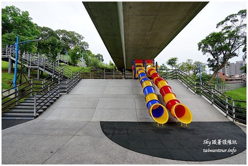 公園超級小只有圖片看到的兩個區塊大而已,溜滑梯一層樓高兩座,搖搖馬x2,在高鐵高架下方可看高鐵,五歲以下玩有趣,較大孩童會覺得很無聊!明明就不到一層樓高,為什麼網頁寫2層樓高