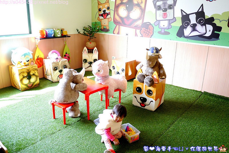 花嘿熊狗狗主題餐廳是間親子竉物餐廳,就在桃園縣龍潭鄉,不僅可以帶小孩來,也很歡迎毛小孩。餐廳裡有許多可愛小狗公仔,小狗造型的板凳超吸睛。店內角落規劃了一區兒童遊戲區,遊戲區裡舖設草皮造型軟墊,有布偶、搖搖馬、大小積木...等玩具。