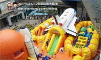 像是可以爬到太空梭上面,上面有氣墊跳跳床,還可以坐溜滑梯下來。