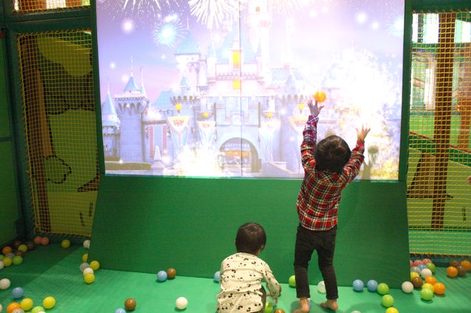 在這區還有一個投影幕,小朋友也可以拿球與投影機的畫面做互動。