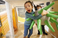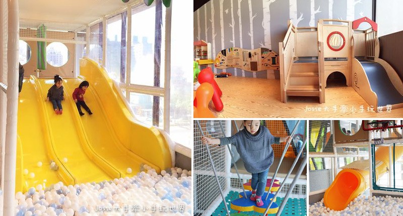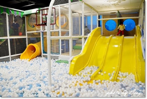 屬於2歲以上小朋友的遊戲區則有大型溜滑梯球池,溜滑梯有旋轉型與波浪型二種,刺激好玩。藍白色球池讓視覺空間更寬敞。其它還有可騎乘的玩具車、平衡木、障礙區與彈跳床,讓小朋友盡情放電。