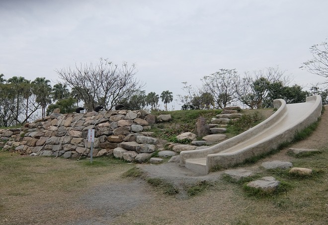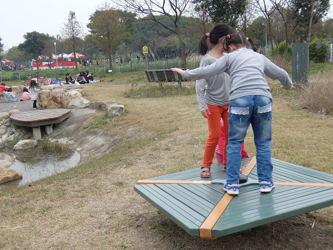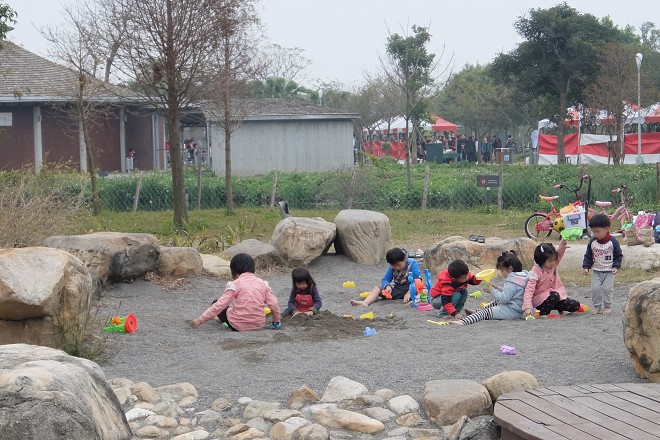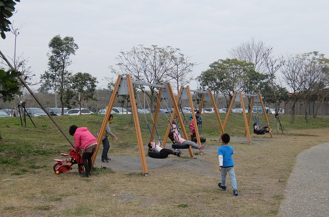 入口處一旁還有兒童遊樂設施,有盪鞦韆,溜滑梯、小型攀岩場、沙坑與平衡遊樂器材,加上園區內的大草地,來這裡玩上一整天也不怕膩。