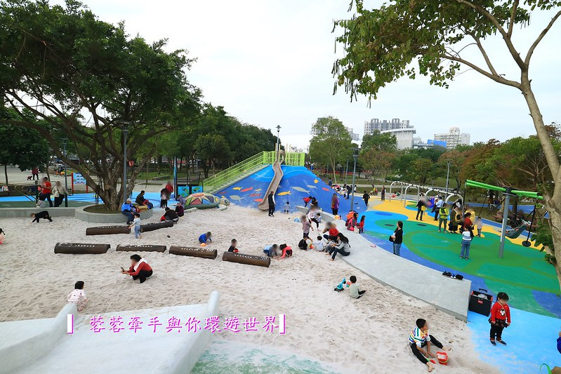2020/01/21公園內全新共融遊戲場啟用,充滿海洋元素的遊戲場,有2座攀爬山丘溜滑梯遊具、超大細白沙坑、沙桌、挖土機、平衡木、360度旋轉遊具等,而盪鞦韆有一般、包覆式、座椅與鳥巢4種。