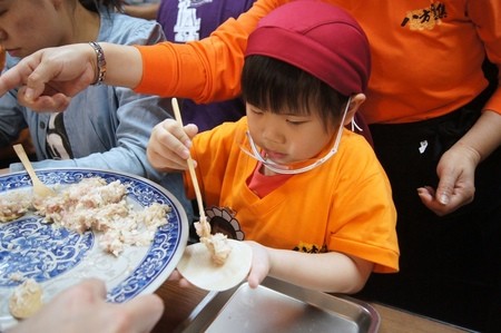 完成報名換上小制服,還有圍裙與頭巾,聽完活動流程相關介紹後,開始動手包鍋貼。因為全程需要小朋友自己親手操作,所以活動限4-7歲參加。包好鍋貼後接著至收銀台練習點餐結帳,待鍋貼煎好,就可以享用自己包的鍋貼。