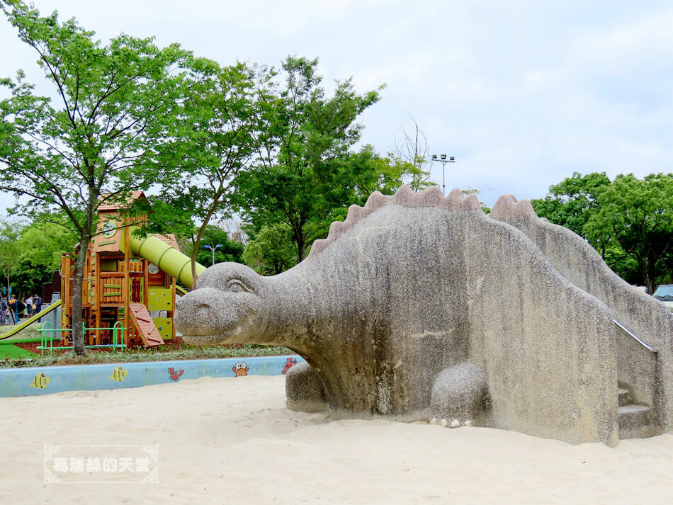 大沙坑旁另有一座小一點的沙坑,沙坑上是小朋友愛的恐龍造型磨石子溜滑梯。