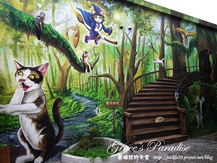 魔法喵屋的彩繪者與知名彩繪牆「雲林-屋頂上的貓」是同一人,精湛的畫技,栩栩如生的貓咪,每一隻貓的表情都好生動,由畫面延伸出的實體裝置,拍起照來更有感。