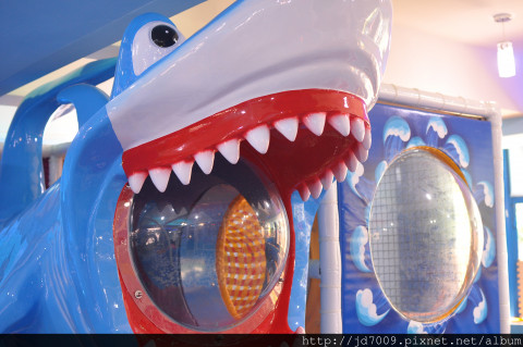 遊戲區位在餐廳內側,有藍色球池海、可愛大鯊魚、溜滑梯、彈跳床,還有決明子沙坑與0-3歲扮家家酒區。球池上方還有幾顆大、小球,與一隻大海星,充滿歡樂氣氛的海底樂園,等你來同樂。