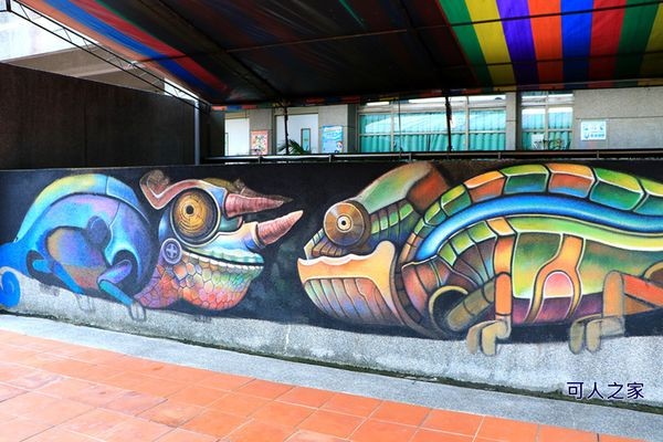 位在彰化田中的新民國小也有3D彩繪牆,彩繪牆範圍不大,但鮮艷的色彩、細緻的構圖與繪圖技巧,非常吸引人。
