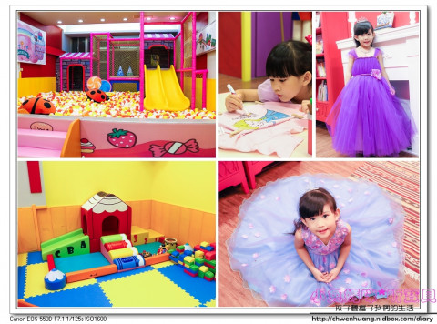 店內有多套兒童禮服供小朋友換裝拍照,這裡的禮服非一般換裝公主服,每件都很漂亮,也有提供頭紗、皇冠等飾品。兒童遊戲區位在二樓,有溜滑梯球池、寶寶爬爬區與大積木,一樓也有繪本桌遊讓小朋友閱讀遊樂。